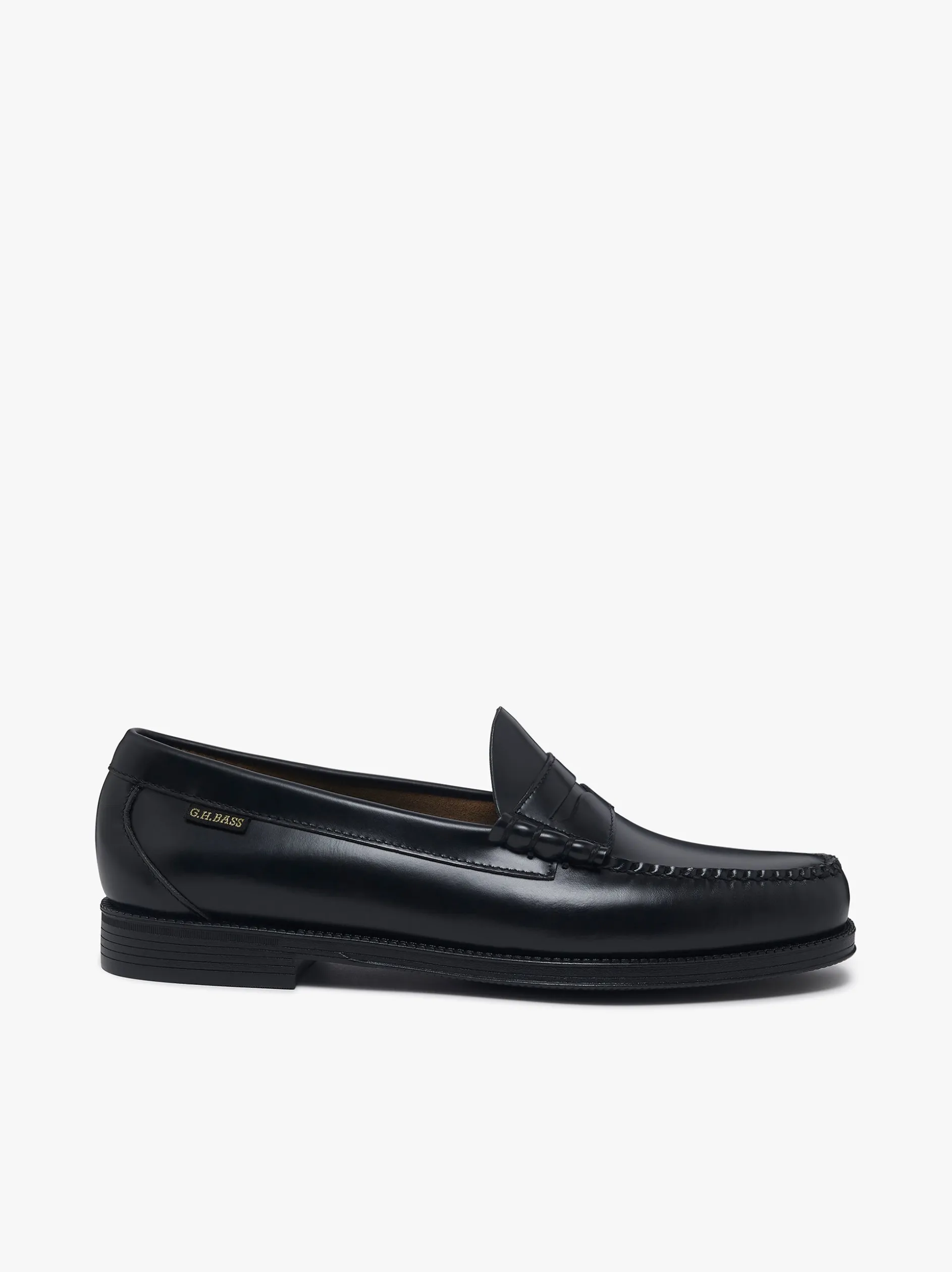 The Easy Weejuns Larson Flag Penny Loafers, crafted in black polished leather, feature our new woven G.H.BASS flag with our iconic golden signature. Hand-stitched, these loafers feature a soft cushioned insole for all day comfort. A waterproof rubber ensures long-lasting durability and easy year-round wear. Pair with tailored burgundy suiting or dress them down with cuffed jeans and a white tee. Perfectly for both smart events and casual weekends. The ultimate wardrobe staple for men.