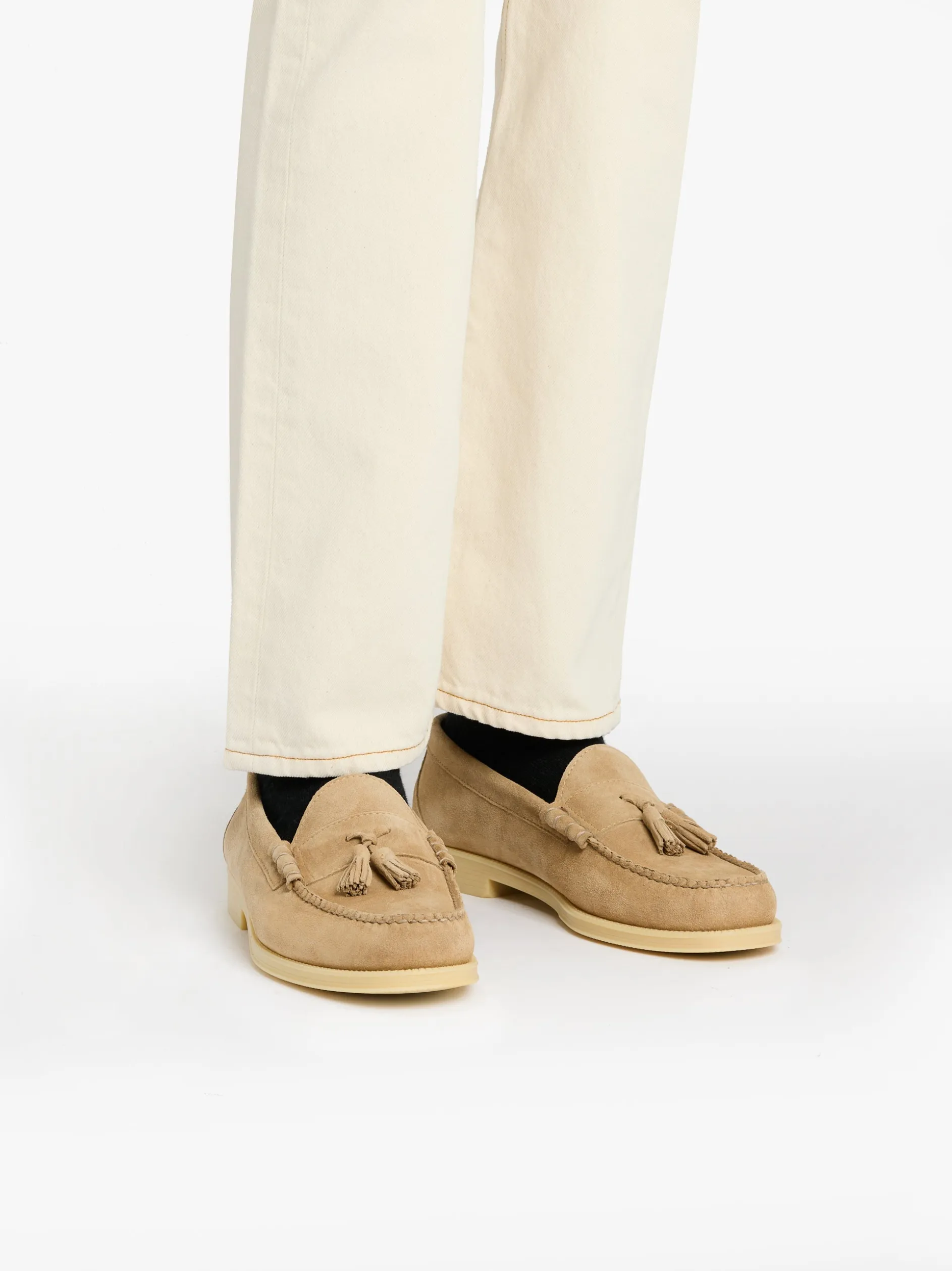 The Easy Weejuns Lennox in an an off-white suede. Designed for both comfort and style, the luxurious suede offers an ultra soft feel. The playful decorative tassels transform these men’s loafers into a versatile wardrobe essential. Handsewn by skilled craftsmen, these loafers showcase superior craftsmanship. A cushioned insole provides superior comfort, while the water-resistant rubber sole offers optimal grip and durability. Pair with tailored chinos and a lightweight blazer for a polished ensemble or option for a relaxed vibe with shorts and a white or olive toned t-shirt.