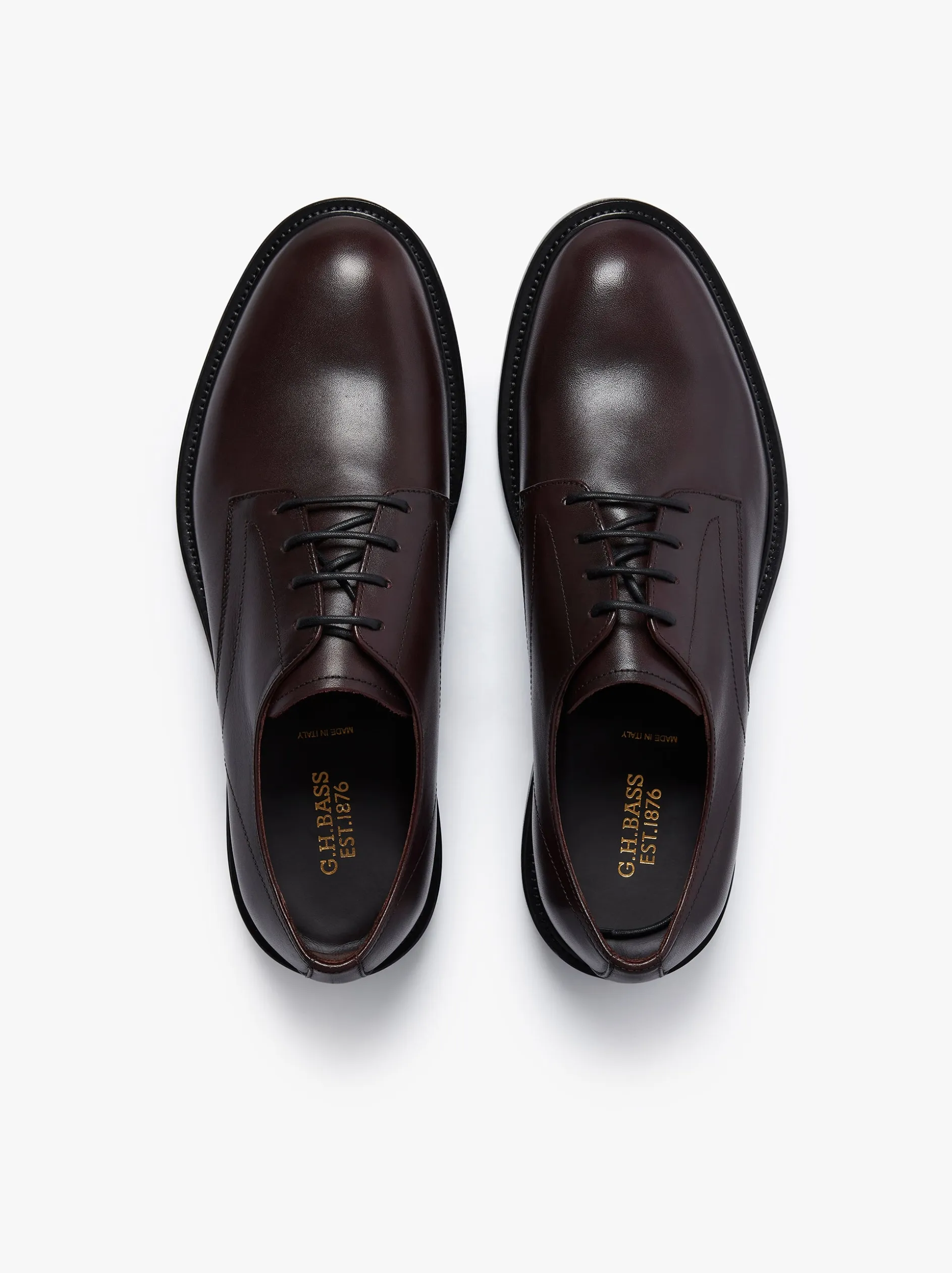 Introducing the Franklin derby in polished wine leather, a sophisticated staple for every wardrobe. Crafted from premium wine leather and hand-polished by skilled craftsmen, these shoes are fitted with internal cushioning and a breathable leather lining for comfort and style. The lace-up design ensures a secure and comfortable fit, while the leather sole provides a refined finish. Perfect for both smart and casual events, combine these men’s polished black derbies with tailored, cropped trousers, a fitted merino wool crew neck sweater, and a tailored blazer in a contrasting colour for a smart and sophisticated look.