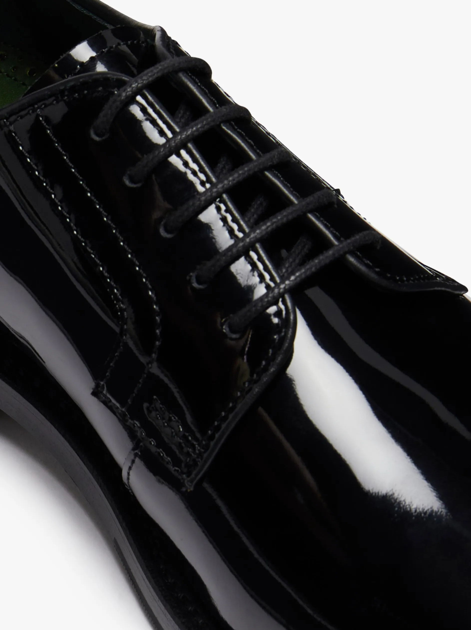 The Monogram Patent Derby reinvents traditional smart and formal footwear with a contemporary twist, showcasing a sleek high-shine black patent leather finish. As part of our Monogram range, originally designed in 1939, the Monogram Patent Derby features gold branding on an ultra-soft green insock. Lined with the most luxurious and supple leathers, they offer the wearer breathability and comfort. Completed with the signature antique gold outsole plate, its a subtle mark of our dedication to quality. Made to be worn all year round, these are high-quality lace-up shoes designed to last for years through strengthened stitching, rubber heel taps, and cushioned insoles. The perfect dress shoe to make a distinguished statement, adding the perfect finish to wedding tailoring and formal suiting.