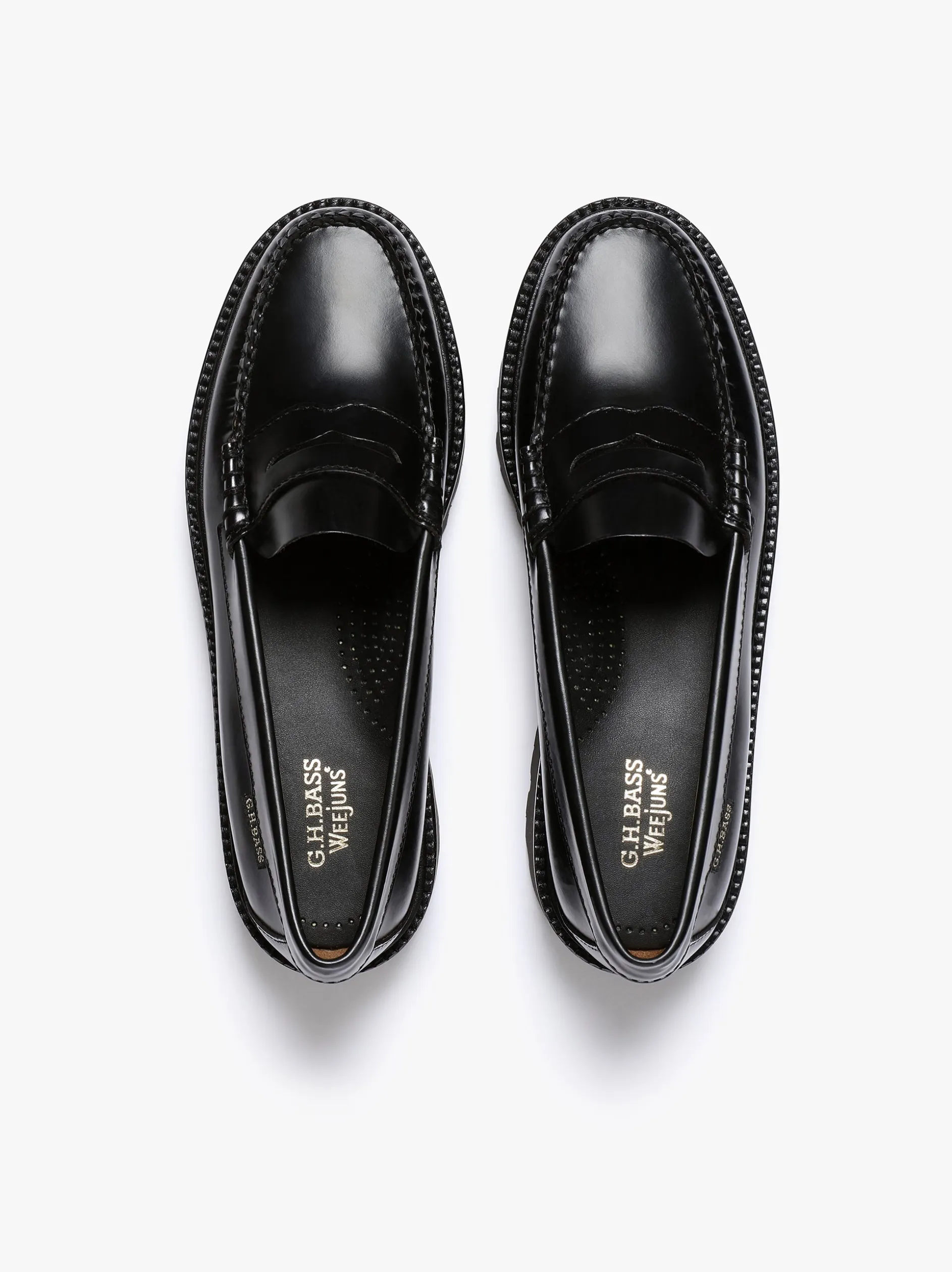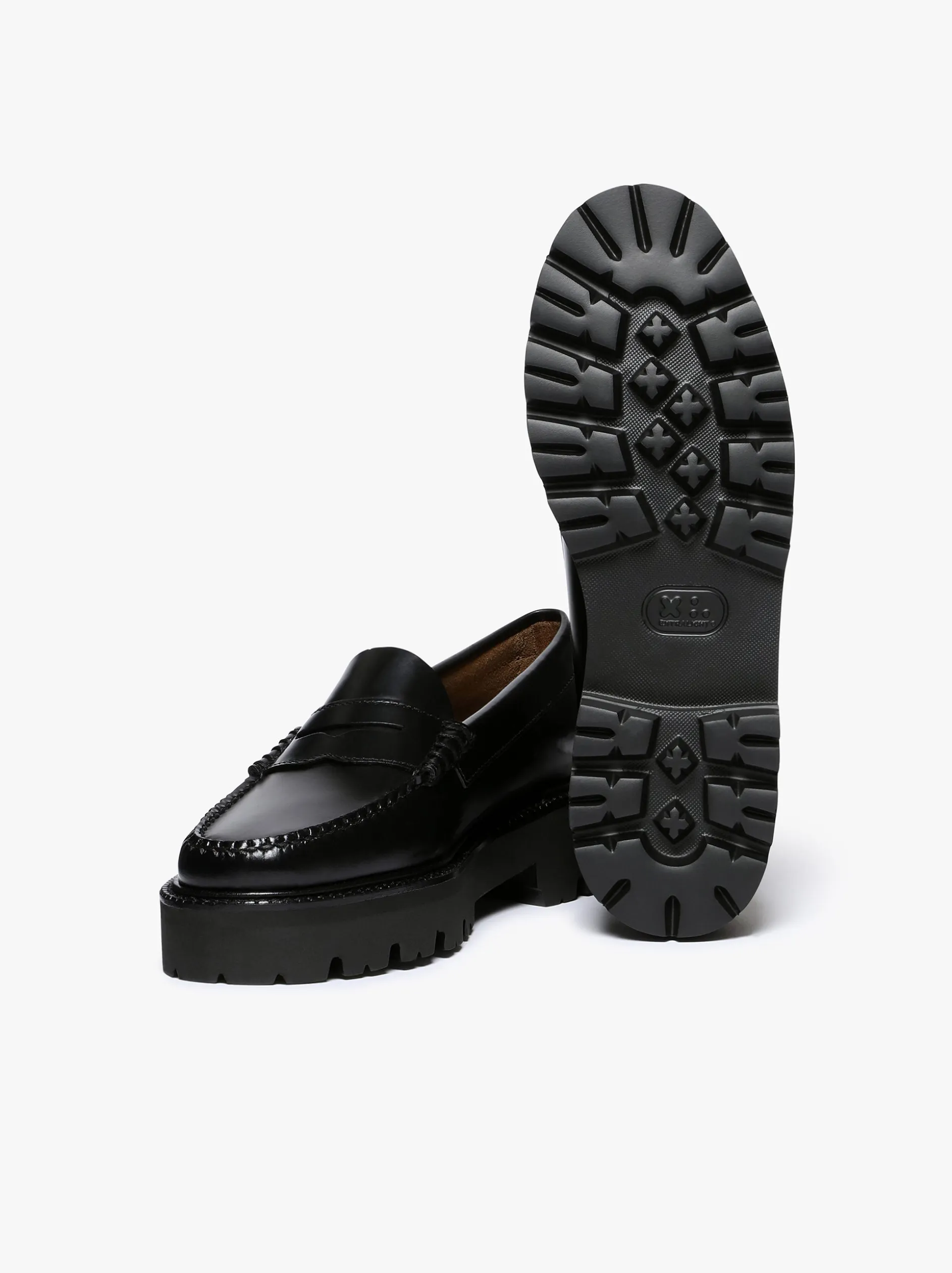 A classic silhouette with a bold, chunky attitude. Crafted from a polished black leather the Weejuns Super Lug Penny Loafers retain the elegant structure of the original penny loafer, while the oversized EVA lug sole adds a chunky modern twist. Hand-stitched and finished with the signature G.H.BASS woven flag, these loafers are built for everyday endurance. The shock-absorbing EVA midsole and strategically placed lugs deliver comfort and grip. Inside, a plush cushioned insole and soft leather insock offer lasting comfort. Style these loafers with a pleated midi skirt in a neutral or pastel tone or with cropped trousers and a boxy denim jacket.