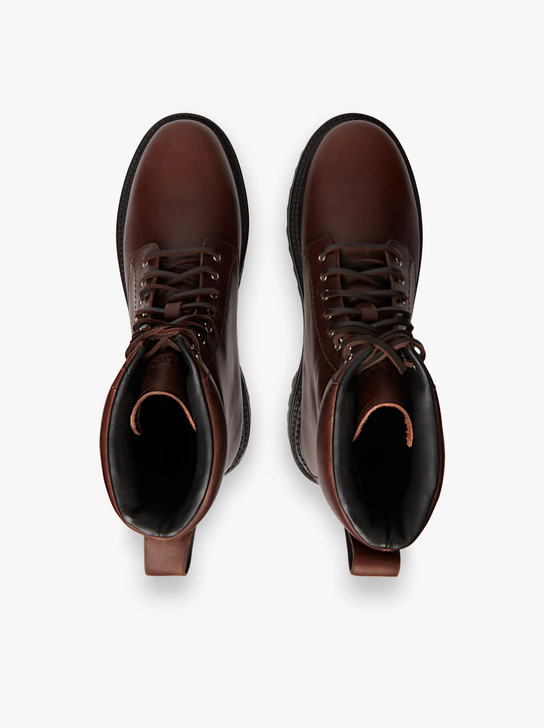 Crafted from dark brown leather with a smooth finish, the Benson Combat Boot gives utility styling a more refined, polished attitude. Built with purpose and shaped by craft using time-honoured construction techniques, each pair reflects our commitment to durability and design. Leather laces and a hand-stitched finish lend a tailored feel, while the reinforced welt stitch strengthens the boot’s resilience. Inside, a soft leather lining and cushioned insole provide immediate comfort and support. Set on a water-resistant Vibram EVA lug sole engineered to deliver optimal grip and durability while remaining incredibly lightweight.