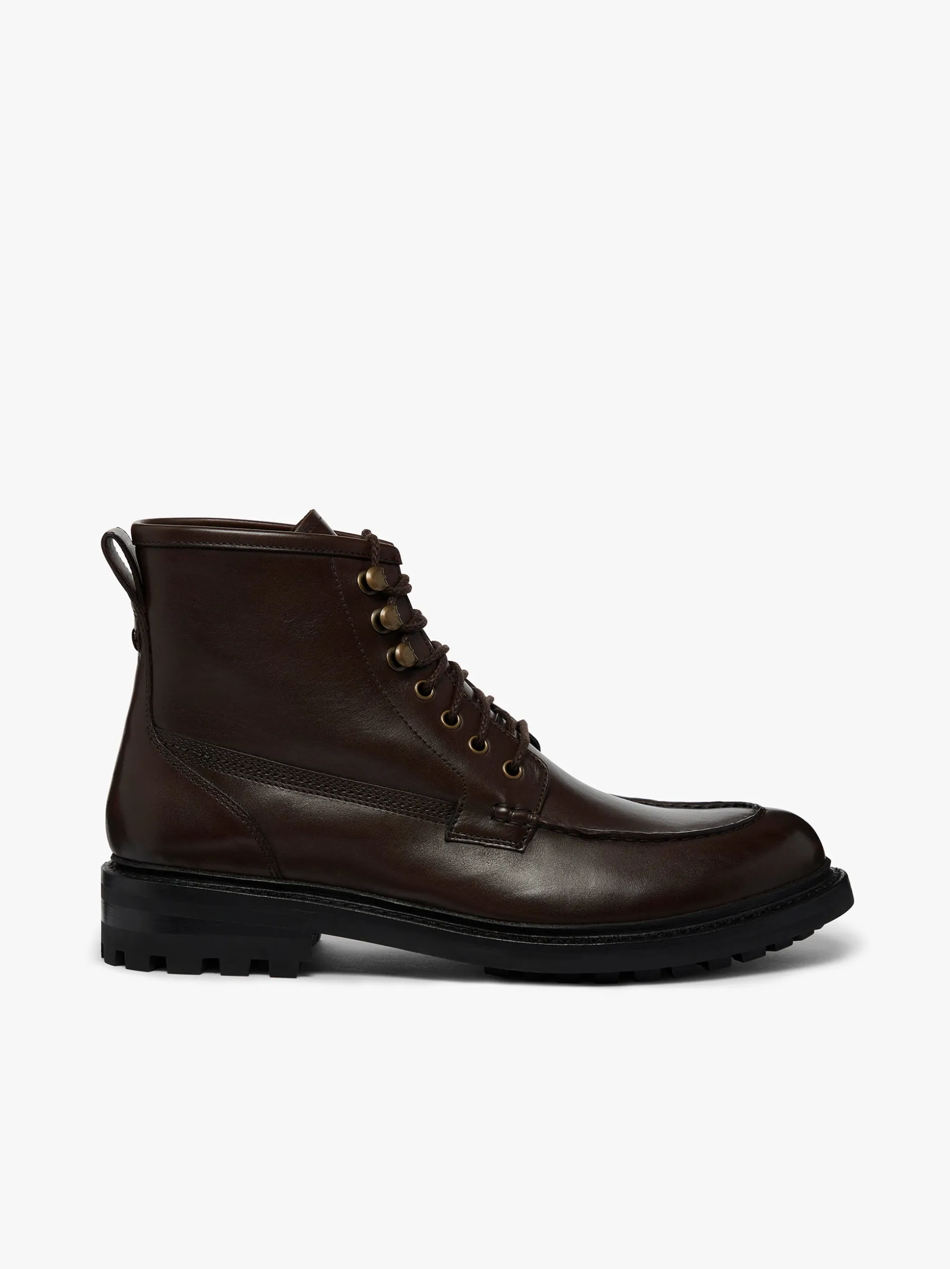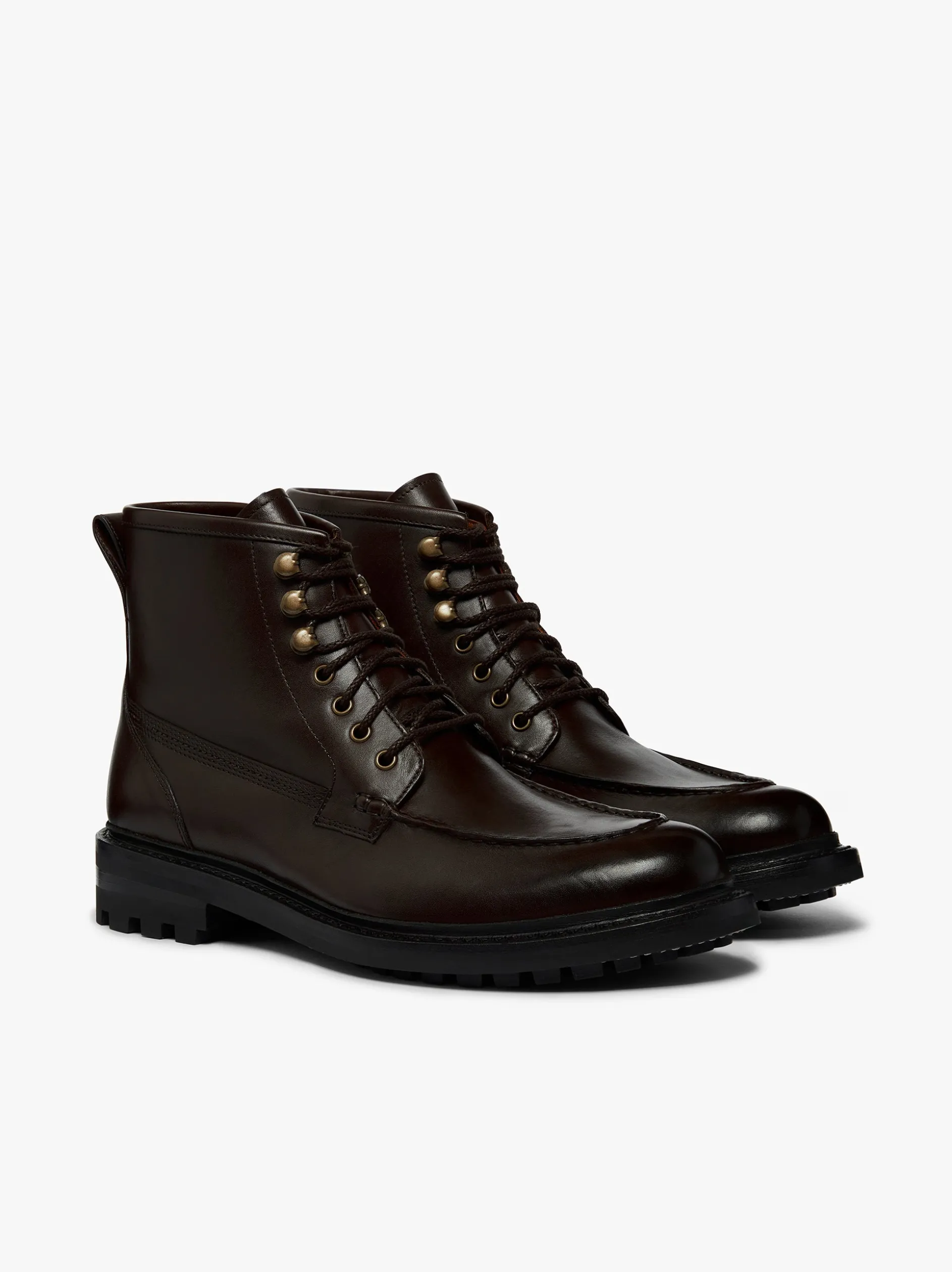 With its handcrafted chocolate leather and subtle sheen, the Chase Moc Toe Boot brings rugged sophistication to your style. The rich leather upper provides a refined yet rugged look, while the plush leather lining ensures all-day comfort. As part of the monogram range, the Chase Moc Toe Boot shoe features a soft green insock and the extra durable goodyear welt stitching. Round woven laces and lace hooks offer a secure fit while a lugged EVA outsole offers exceptional traction and durability without sacrificing the boots smart profile. The sole is designed to provide maximum comfort and support. A combination of sophistication, style, and quality craftsmanship, they are designed for smart, office and casual outings. Perfect for those who appreciate the classic moccasin style, the Chase Moc Toe Boot shoe skillfully blends tradition and modernity.