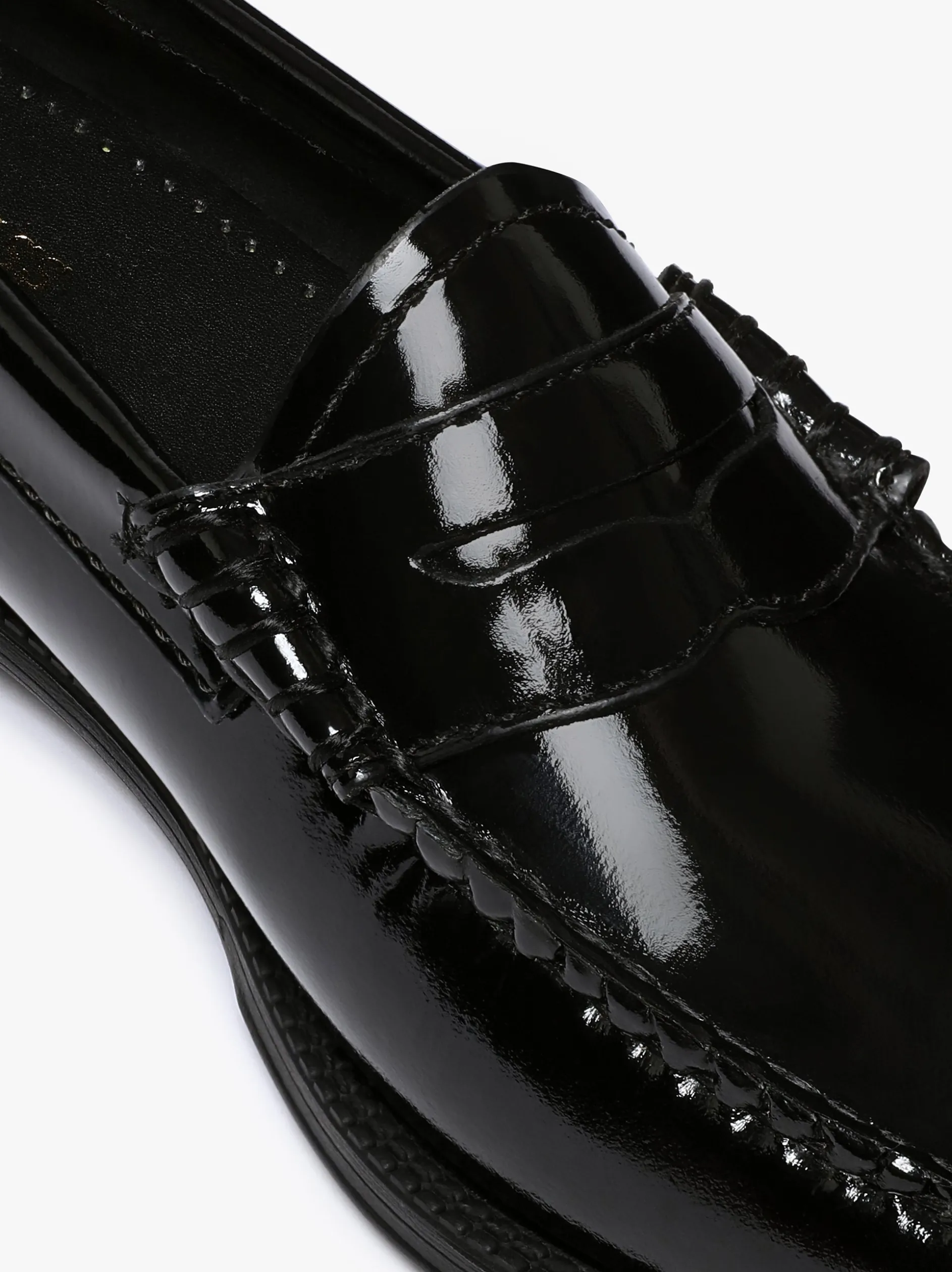 The Easy Weejuns Penny Loafers in black patent leather combine glossy, reflective leather with exceptional craftsmanship. The high-shine finish adds a sophisticated touch while also enhancing water resistance, ensuring the shoes retain their polished look even in wet conditions. Each pair is hand-stitched with reinforced welt detailing, reflecting our dedication to traditional shoemaking techniques. Set on a water-resistant, high-traction Easy Weejuns rubber sole, they offer durability and stability with every step. Inside, a soft leather insock and cushioned insole provide all-day comfort. Elegant yet versatile, these women’s loafers pair perfectly with flowing maxi dresses or tailored chinos.