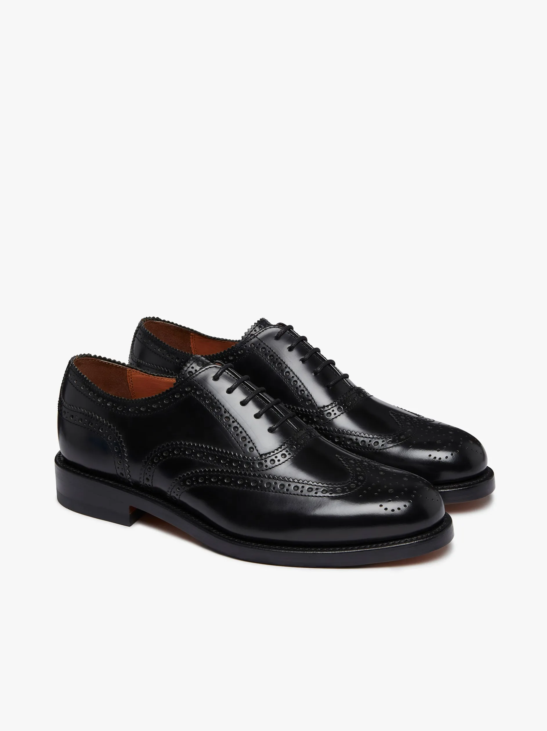 Monogram Double Brogue Wingtip are shoes built to last. Part of the Monogram lace up range first introduced in 1939, the shoes have been crafted from a luxurious polished black leather. The shoes feature a classic decorated brogue design. The interior is lined with leather, ensuring both breathability and comfort. A mark of quality, gold embossed branding adorns the signature green insock. Suitable for a range of occasions from formal to smart-casual, these brogues are designed for versatility, pairing well with a tailored suit and dark denim alike.